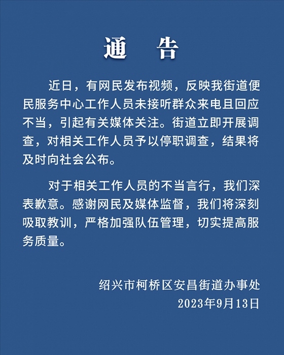 ·浙江紹興有市民發(fā)視頻稱,打不通安昌便民中心電話,來到現(xiàn)場發(fā)現(xiàn)工作人員都在聊天,吐槽電話是擺設。官方通報:相關工作人員停職調查。