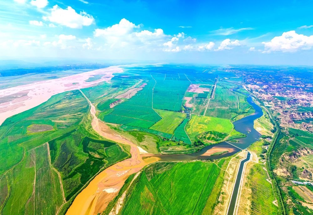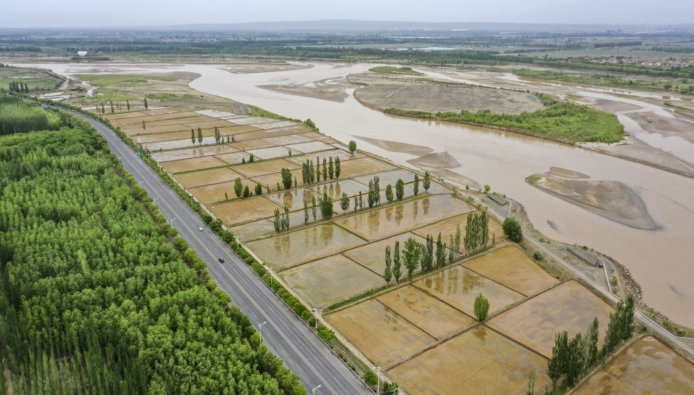 流經(jīng)寧夏青銅峽市境內(nèi)的黃河,滋潤(rùn)著岸邊水稻和各種植被(無人機(jī)照片,5月25日攝)。新華社記者馮開華 攝