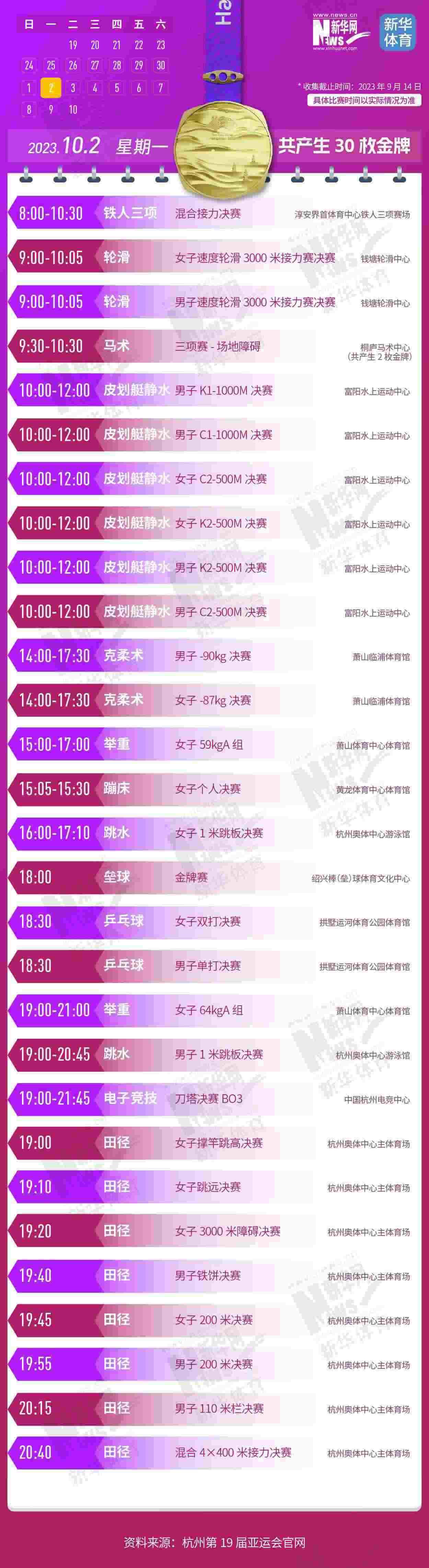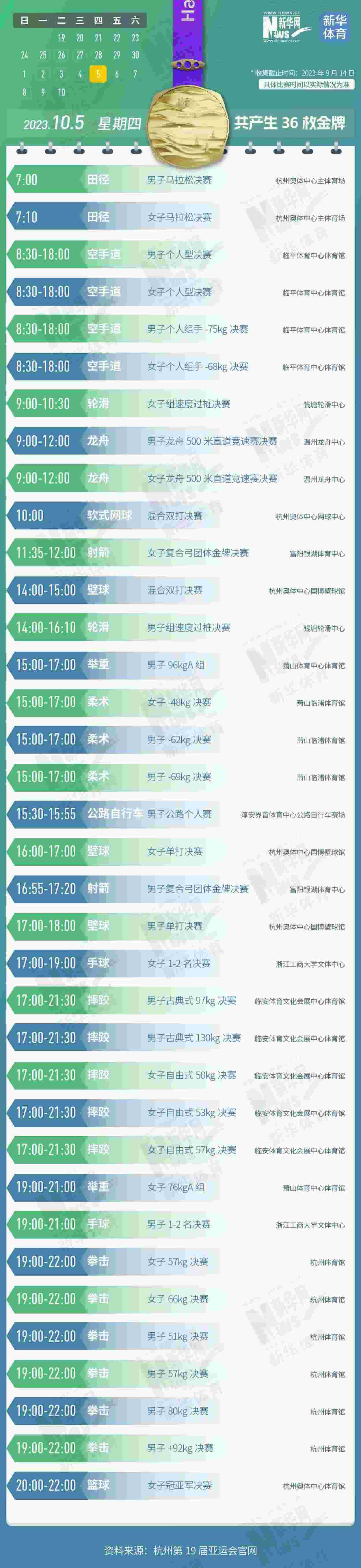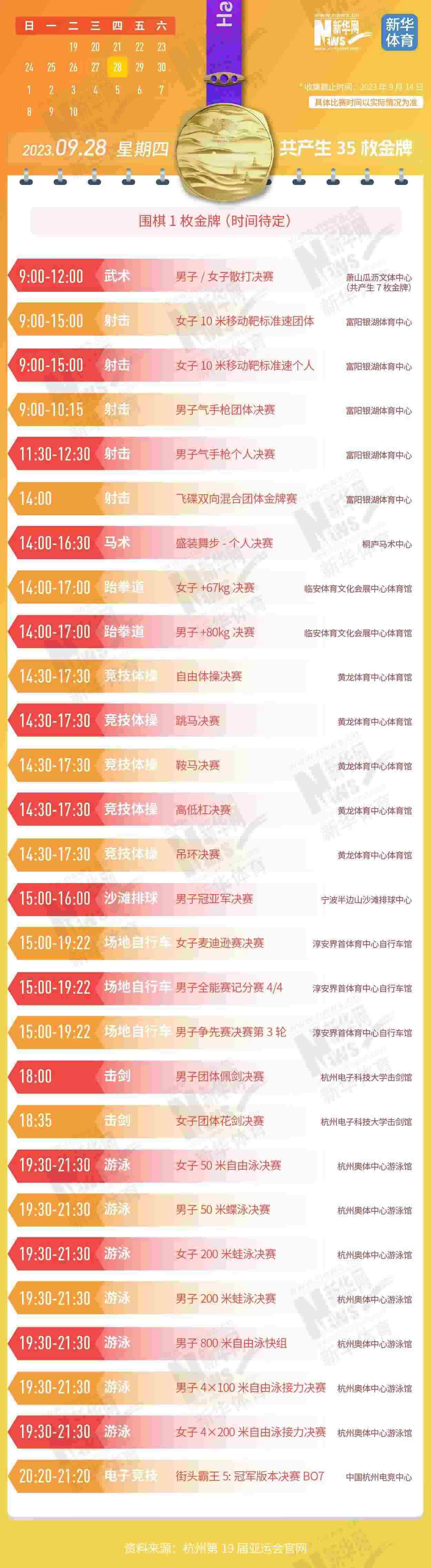 杭州第19屆亞運會即將開幕。本屆亞運會將產(chǎn)生481枚金牌,快收藏這份金牌賽事日歷,助你精準(zhǔn)觀賽!