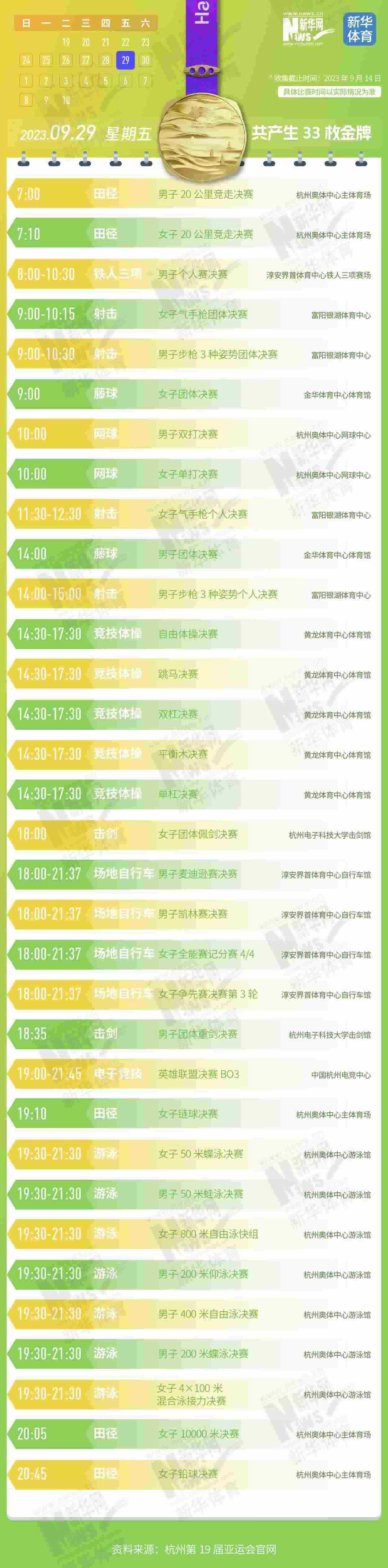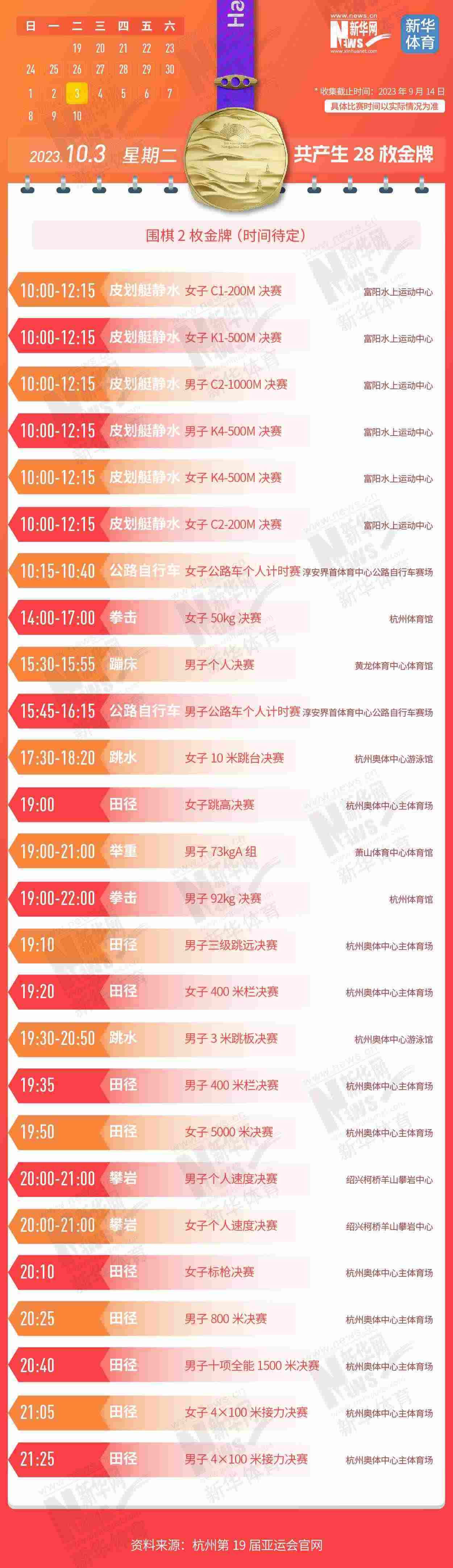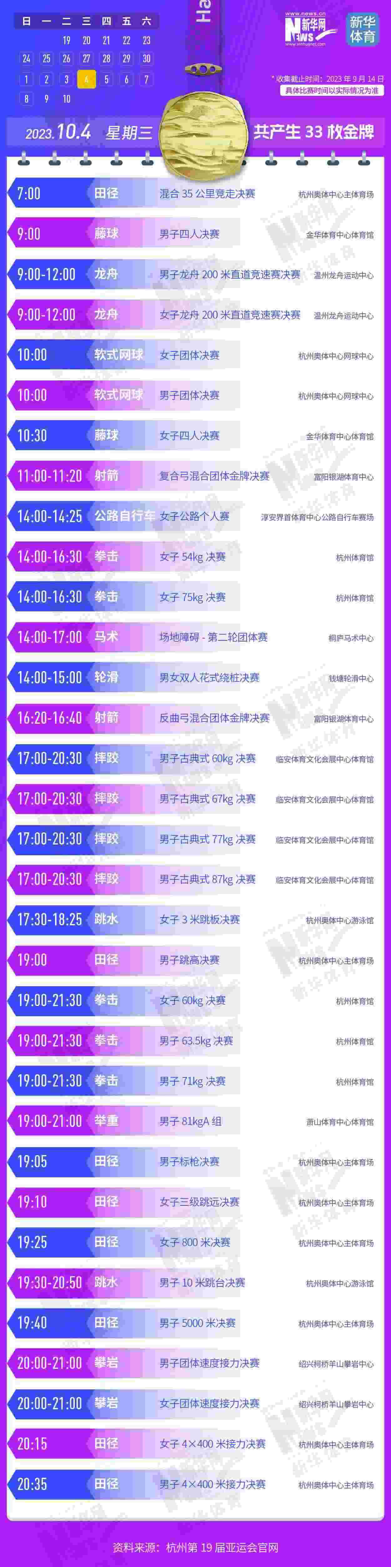 杭州第19屆亞運會即將開幕。本屆亞運會將產(chǎn)生481枚金牌,快收藏這份金牌賽事日歷,助你精準(zhǔn)觀賽!