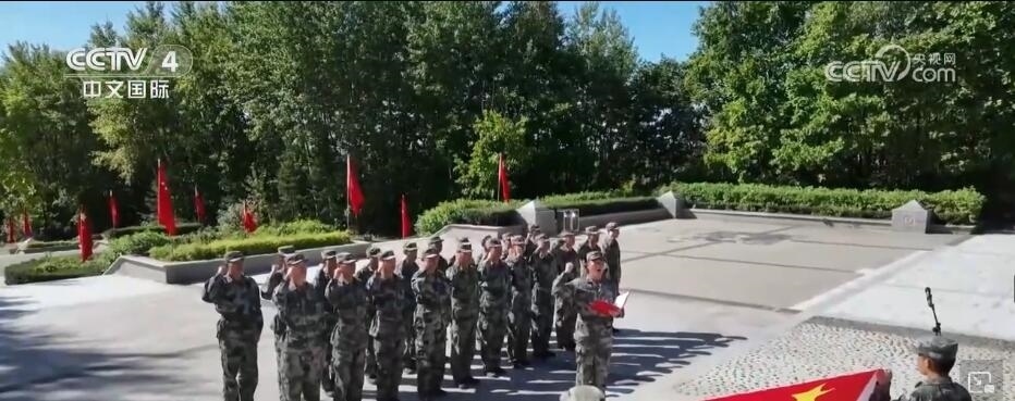 在黑龍江省虎林市第二次世界大戰(zhàn)終結(jié)地紀念園,入伍新兵面向軍旗、高舉右拳,向軍旗宣誓,以此向英雄致敬。在紀念碑前,全體人員整齊列隊,肅立脫帽,向逝者默哀,并敬獻花籃。