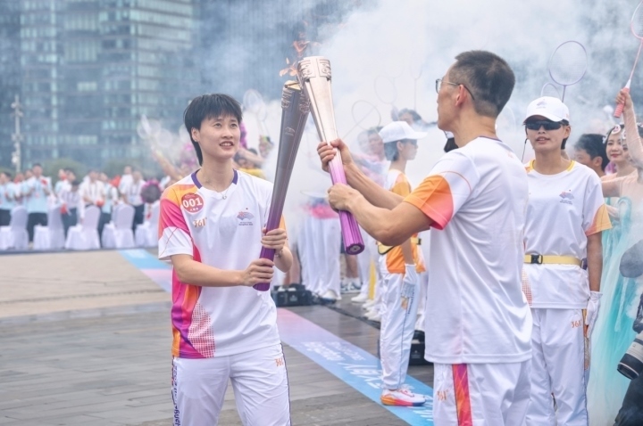 第1棒火炬手陳雨菲和第二棒火炬手、西湖大學(xué)校長(zhǎng)施一公進(jìn)行火炬交接