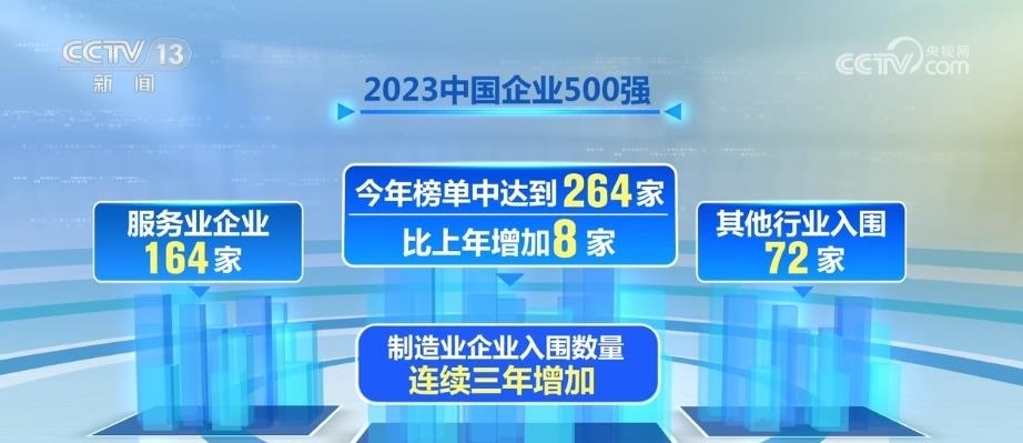 9月20日,中國企業(yè)聯(lián)合會發(fā)布了“2023中國企業(yè)500強”榜單。2023中國企業(yè)500強中,制造業(yè)企業(yè)入圍數(shù)量連續(xù)三年增加,2023年榜單中達到264家,比上年增加8家,服務(wù)業(yè)企業(yè)164家,其他行業(yè)入圍72家。從換榜情況來看,有48家新入圍或重新入圍企業(yè),這些企業(yè)中,制造業(yè)有28家,占比58.33%。