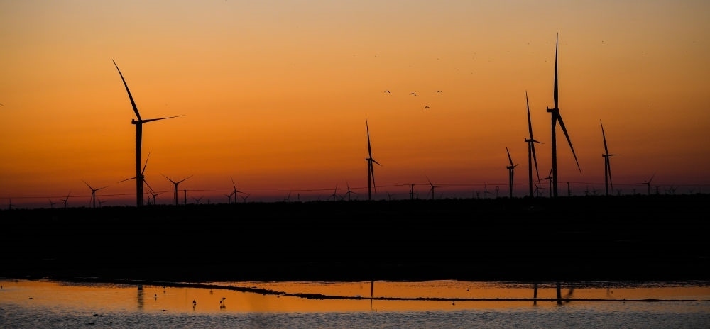 落日時分拍攝的東臺沿海經(jīng)濟(jì)區(qū)風(fēng)力發(fā)電機(jī)組(無人機(jī)照片,8月31日攝)。