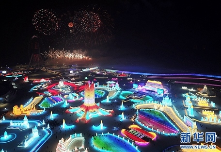 焰火在冰雪大世界園區(qū)上空綻放(無人機照片)。