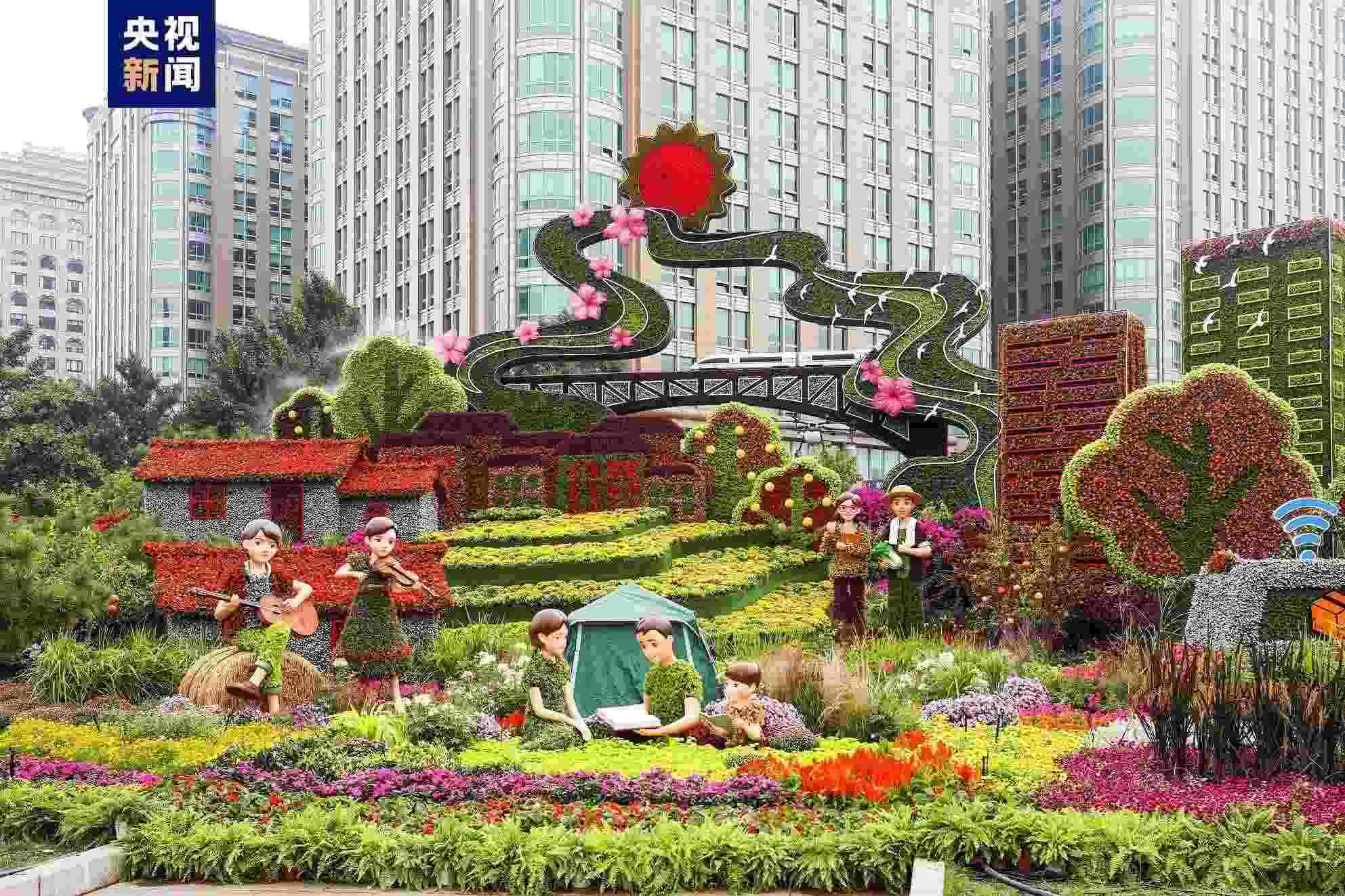 今年廣場花籃首次裝入象征豐收的五谷元素(水稻、小麥、小米、黃米、大豆),花籃內(nèi)的花卉等部件均使用阻燃、抗風(fēng)材料進(jìn)行3D打印,有效保障安全性、穩(wěn)定性和觀賞性。廣場兩側(cè)綠地布置5050平方米吉祥如意花帶圖案,花球18個。長安街建國門至復(fù)興門之間布置10組不同主題的立體花壇,50多個國內(nèi)自主知識產(chǎn)權(quán)新品種、國外引進(jìn)新品種和鄉(xiāng)土植物在長安街花壇中首次應(yīng)用,描繪出全面推進(jìn)中華民族偉大復(fù)興的宏偉藍(lán)圖和人民群眾不斷提升的獲得感、幸福感的美好畫面。長安街、三里河路、阜成路、機(jī)場路四條重點道路布置容器花卉100組、地栽花卉2萬余平方米、花拱花球40余個,為市民游客營造花團(tuán)錦簇的節(jié)日氛圍。