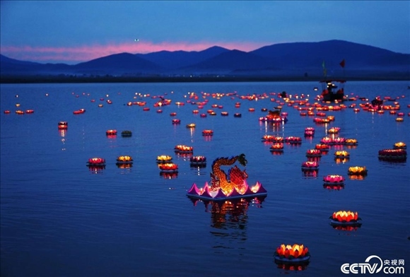 9月24日,吉林,蛟河市漂河鎮(zhèn)富江村舉行豐收節(jié)放河燈活動(dòng),村民和游人把一盞盞河燈放入松花湖中,表達(dá)對(duì)美好生活的向往與期盼。