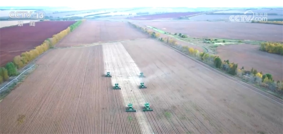 您現(xiàn)在看到的是黑龍江墾區(qū)鶴山農(nóng)場(chǎng)的大豆“高產(chǎn)攻關(guān)”示范田,眼下正是大豆收獲的高產(chǎn)期,農(nóng)場(chǎng)每天出動(dòng)52臺(tái)收獲機(jī),節(jié)糧減損,確保豐收的糧食顆粒歸倉。