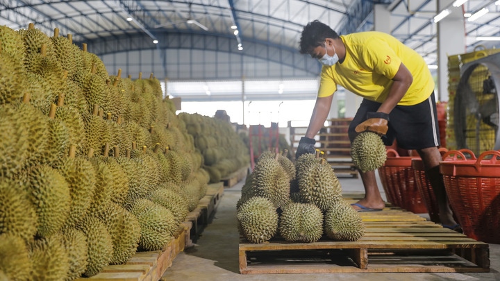 在重慶洪九果品股份有限公司位于泰國尖竹汶府的工廠內(nèi),工作人員在裝運(yùn)銷往中國的榴蓮。新華社發(fā)