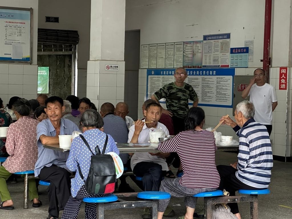長(zhǎng)灘初級(jí)中學(xué)安置點(diǎn)群眾正在用午飯。新華社記者李曉婷 攝