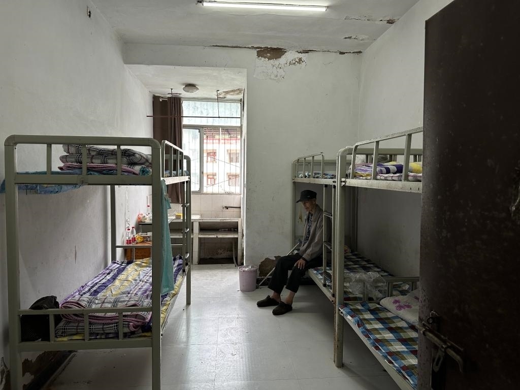 太白西村4組村民譚建和老爺爺行動(dòng)不便,坐在鋪著干凈格子床單的宿舍床上望向窗外?!扒疤煜挛纾鐓^(qū)的車(chē)來(lái)接的我和老伴,安置點(diǎn)吃喝都好,宿舍住起來(lái)也挺舒服。兒子們擔(dān)心我,他們過(guò)不來(lái),一天就打好幾通電話,我說(shuō)都好著呢、好著呢?!弊T爺爺說(shuō)。