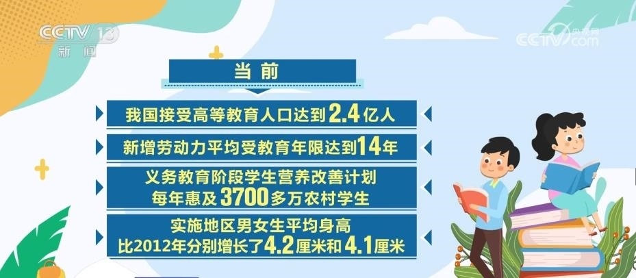 當前,我國接受高等教育人口達到2.4億人,新增勞動力平均受教育年限達到14年。義務教育階段學生營養(yǎng)改善計劃每年惠及3700多萬農村學生,實施地區(qū)男女生平均身高比2012年分別增長了4.2厘米和4.1厘米。