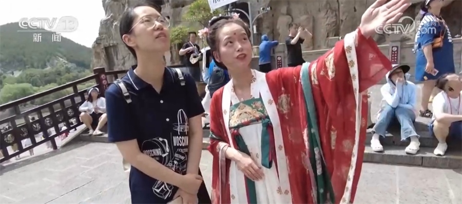 ?????? 記者 徐倩:在龍門(mén)石窟,我發(fā)現(xiàn)一個(gè)很特別的點(diǎn),往年來(lái)這里,都是導(dǎo)游來(lái)陪大家一起逛龍門(mén)石窟、來(lái)講解。今年的導(dǎo)游做了一個(gè)服務(wù)升級(jí),會(huì)穿著這種比較有特色的唐裝。