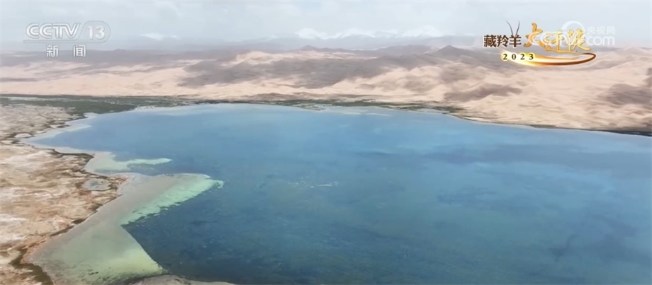 總臺(tái)記者 崔寧:你看這個(gè)鹽堿地長(zhǎng)的是典型的沙漠性植物,然后一路鹽堿,到前面就是浩瀚的阿雅克庫(kù)木湖。這是阿爾金山最大的湖泊,這兒的海拔有4300米左右,所以我們?cè)谶@個(gè)鏡頭當(dāng)中就看到特別奇特的景象,植物、鹽堿、鹽花、水、大片大片的湖泊,非常神奇。