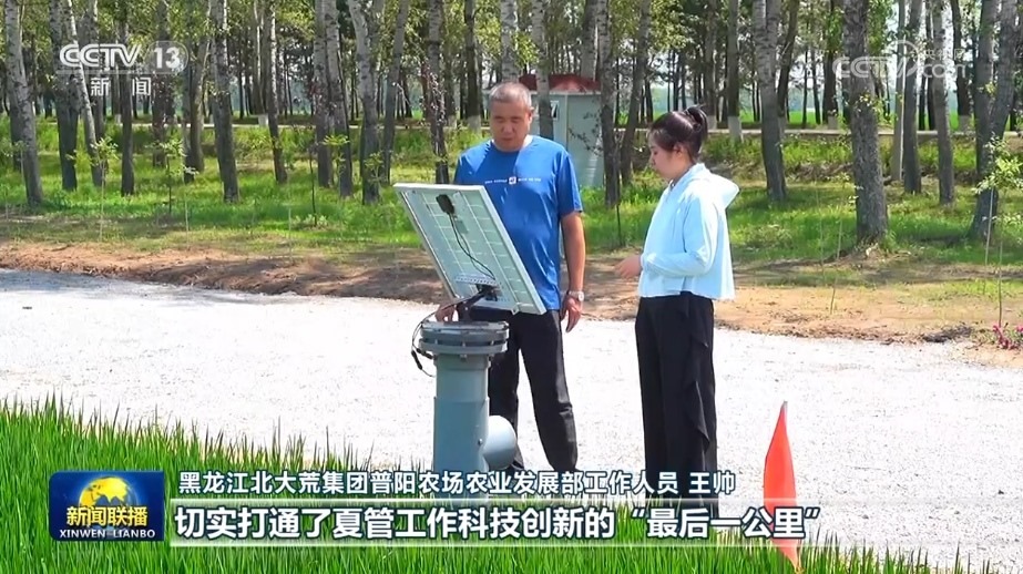 在北大荒普陽農(nóng)場第四管理區(qū)的水稻種植地塊,一套集災情氣象、土壤墑情、病蟲害和苗情長勢監(jiān)測于一體的農(nóng)情監(jiān)測設備,正在24小時不間斷地對水稻生長進行全面監(jiān)控。