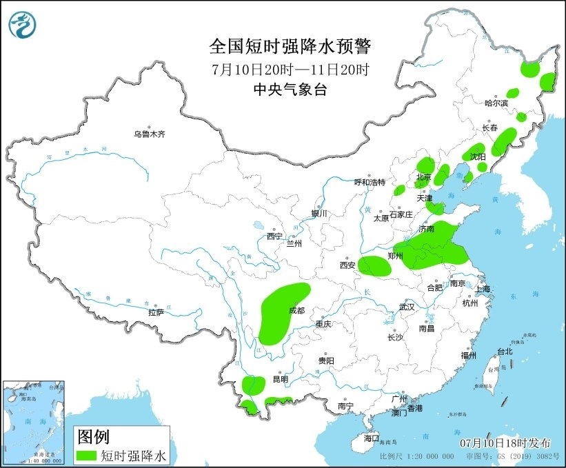 中央氣象臺7月10日18時繼續(xù)發(fā)布強對流天氣藍(lán)色預(yù)警