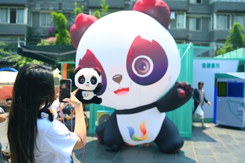 市民拿著大運會吉祥物“蓉寶”合影。成都大運會執(zhí)委會供圖