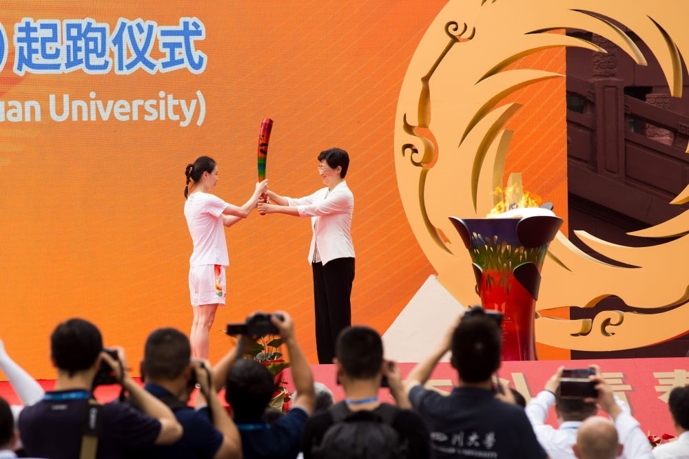 7月2日,第一棒火炬手吳敏霞(左)接過點燃的火炬。當日,成都第31屆世界大學(xué)生夏季運動會火炬?zhèn)鬟f成都站起跑儀式在四川大學(xué)校園內(nèi)舉行。新華社發(fā)(曹鵬攝)