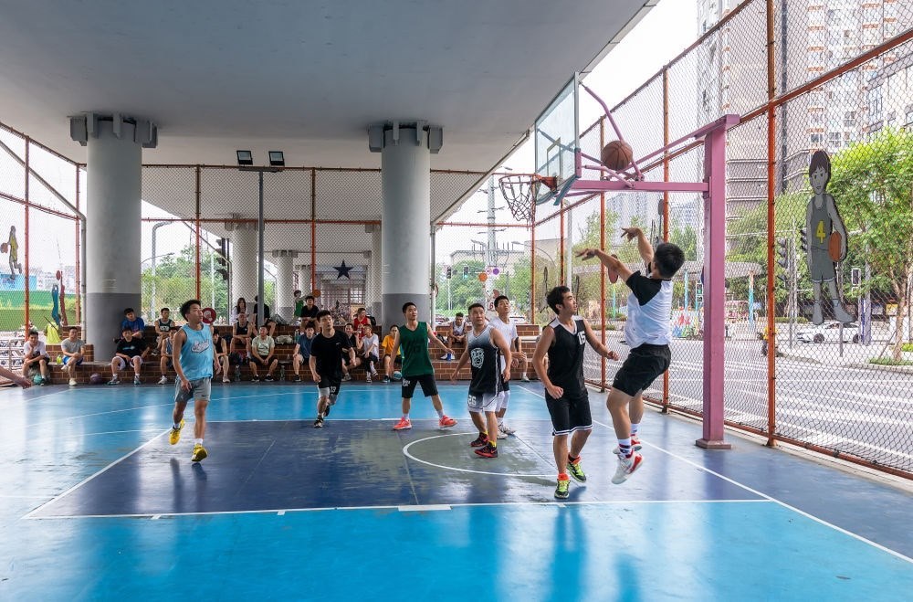2022年6月12日,年輕人在成都市府青路立交下的運動空間打籃球。新華社發(fā)(杜寧攝)