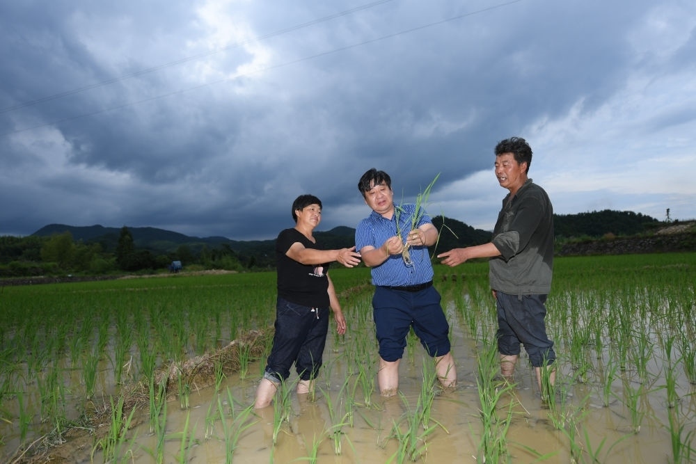在浙江省仙居縣廣度鄉(xiāng)西角村,浙江大學環(huán)境與資源學院教授吳良歡(中)在省級科研試驗田里指導農(nóng)戶進行水稻種植(7月4日攝)。新華社記者 翁忻旸 攝