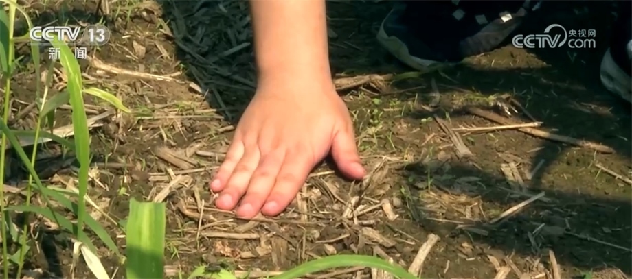 視角繼續(xù)向下來到地面。我們能夠看到田中有很多腐爛的秸稈,這就是當(dāng)?shù)乇Wo(hù)性耕作的核心——秸稈還田。簡單說,就是每年秋收之后將秸稈留在田中,相當(dāng)于給黑土地蓋上了一層“被子”,這樣一來風(fēng)吹不走了、雨也帶不走了。傳統(tǒng)的耕作方式要先將秸稈離田、起壟、播種,農(nóng)機(jī)要多次下地,這里通過研發(fā)保護(hù)性耕作的配套農(nóng)機(jī),將多個步驟歸為一步,同時采取免耕、少耕等辦法,最大程度減少對黑土地的破壞。