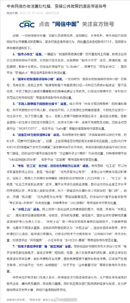 ·中央網(wǎng)信辦查處杜撰歪解公共政策造謠傳謠賬號,通報(bào)典型案例,共處置違法違規(guī)賬號373個。
