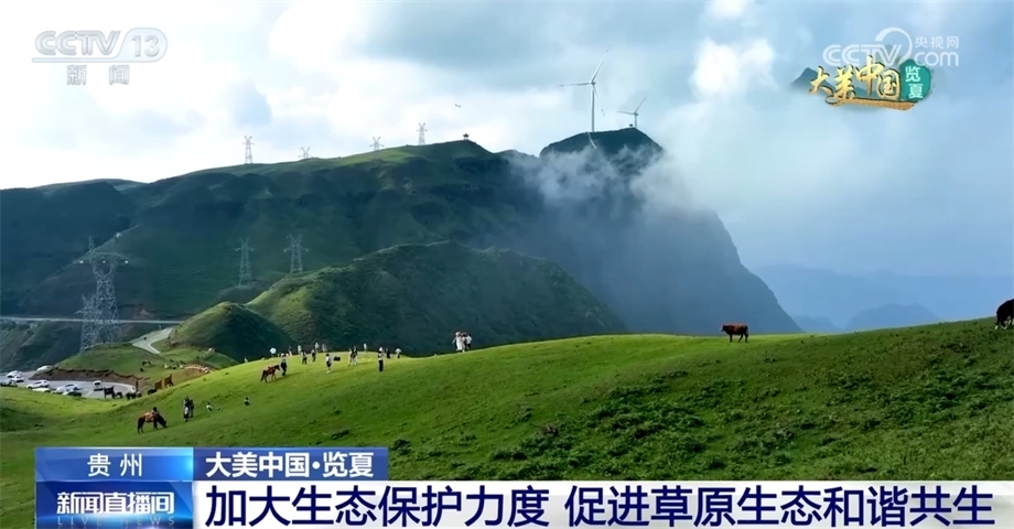 跟隨鏡頭,我們來(lái)到貴州六盤(pán)水盤(pán)州市的烏蒙大草原。眼下,正值盛夏的烏蒙大草原水草豐茂、碧綠如茵、牛羊成群,從空中俯瞰,縹緲的云霧將草原裝扮得十分夢(mèng)幻。烏蒙大草原最高海拔2857米。因?yàn)榈靥幐吆0蔚貐^(qū),這里的氣候適宜,吸引了許多游客來(lái)到這里避暑旅游。近年來(lái),當(dāng)?shù)丶哟髮?duì)村民和游客的宣傳引導(dǎo)力度,并采取措施限制過(guò)度放牧,嚴(yán)厲打擊采挖野生高原矮杜鵑和駕車(chē)碾壓草地等行為,保護(hù)草原生態(tài)平衡,維護(hù)生物多樣性,讓烏蒙大草原生態(tài)持續(xù)向好,實(shí)現(xiàn)人與自然和諧共生。