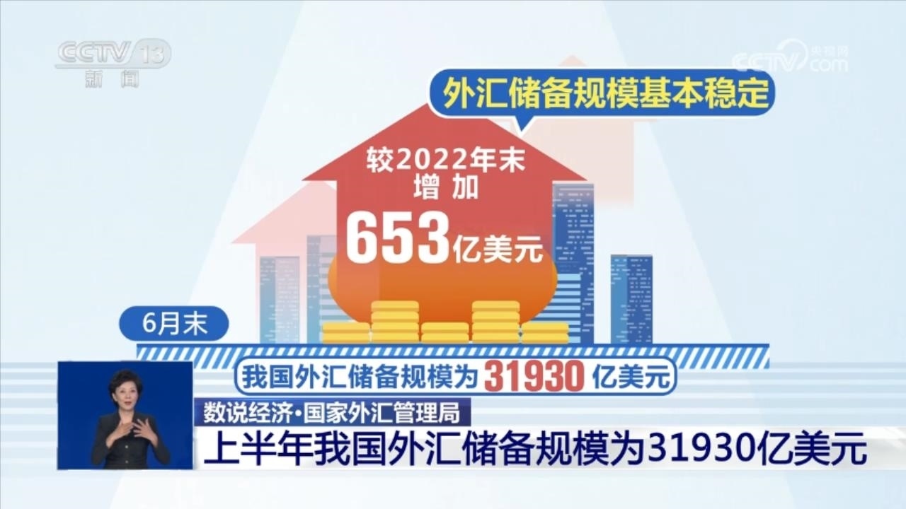 外匯儲(chǔ)備規(guī)?;痉€(wěn)定。截至2023年6月末,我國(guó)外匯儲(chǔ)備規(guī)模為31930億美元,較2022年末增加653億美元。