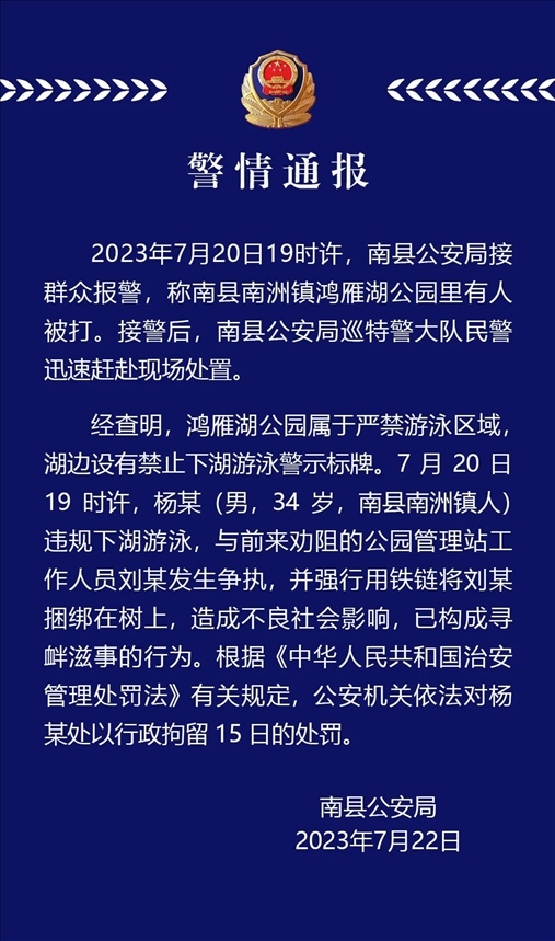 ·男子下湖游泳違規(guī)、將勸阻人員鎖在樹(shù)上,湖南益陽(yáng)市南縣警方通報(bào)。