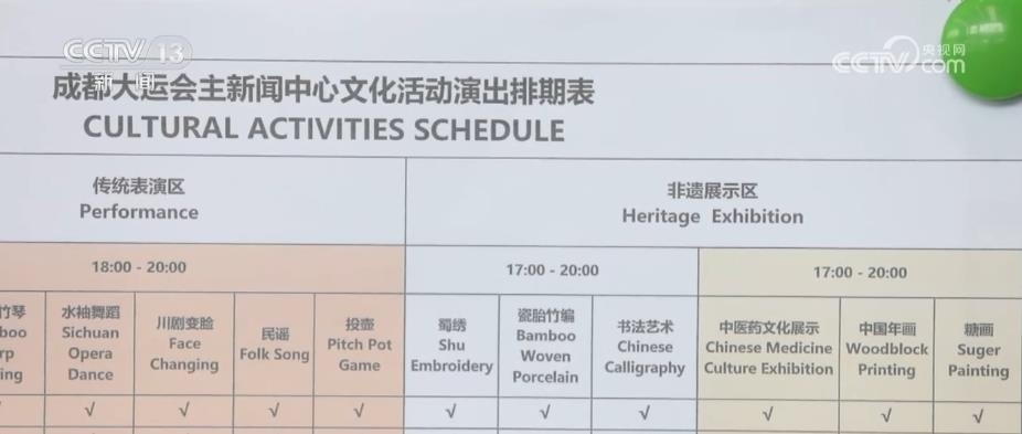 為了讓記者在繁忙的新聞報(bào)道之余,勞逸結(jié)合、舒緩身心,每天下午5時(shí)到晚間,主媒體中心都安排了豐富多彩的非遺文化活動(dòng),包括蜀錦蜀繡、川劇變臉、四川竹琴、瓷胎竹編等,讓中外記者感受獨(dú)具特色的巴蜀文化。