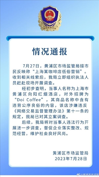 ·上海黃浦通報(bào)“咖啡店低俗營(yíng)銷(xiāo)”:違背公序良俗,已立案調(diào)查。