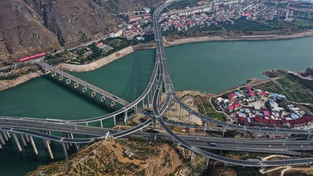 2022年12月30日,俯瞰峨眉至漢源高速公路流沙河樞紐互通(無人機照片)。新華社發(fā)(冉闖 攝)