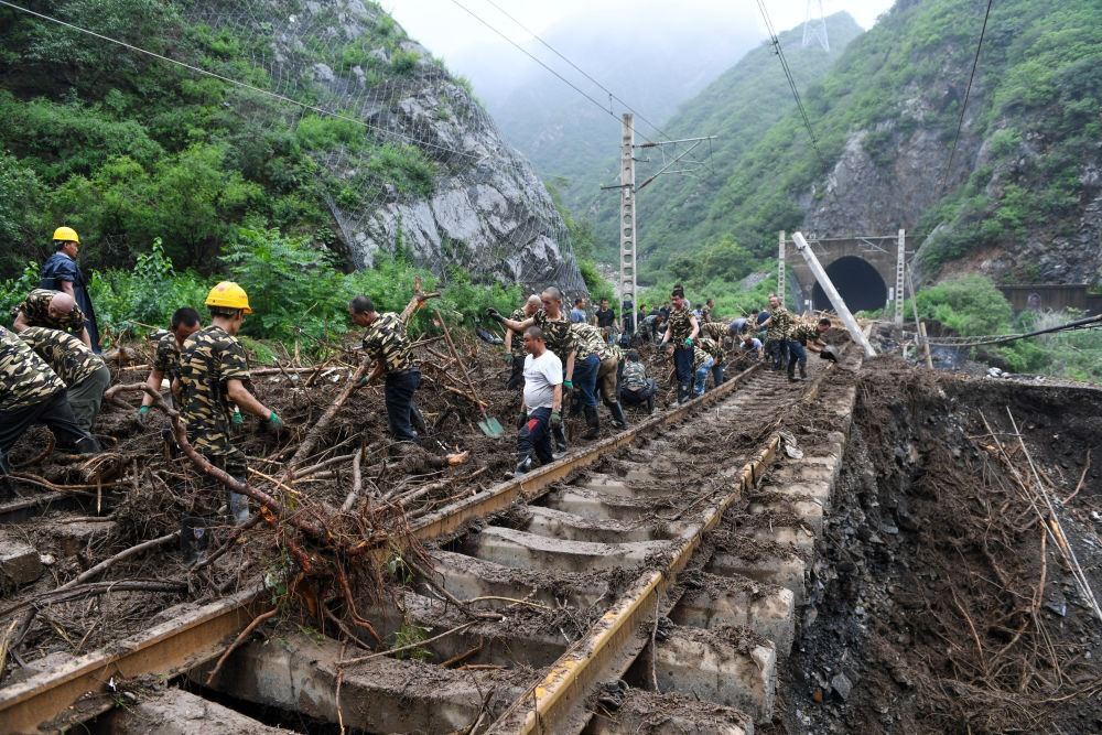 8月1日,在北京市門頭溝區(qū)水峪嘴村附近一段被阻斷的鐵路線上,中鐵六局的工作人員在清理軌道上的雜物,全力恢復(fù)交通。新華社記者 鞠煥宗 攝
