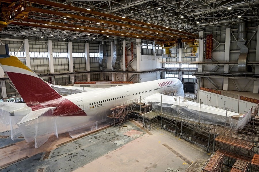 5月11日,噴涂作業(yè)員對空客A350-900寬體客機(jī)進(jìn)行打磨除漆。新華社記者 張麗蕓 攝