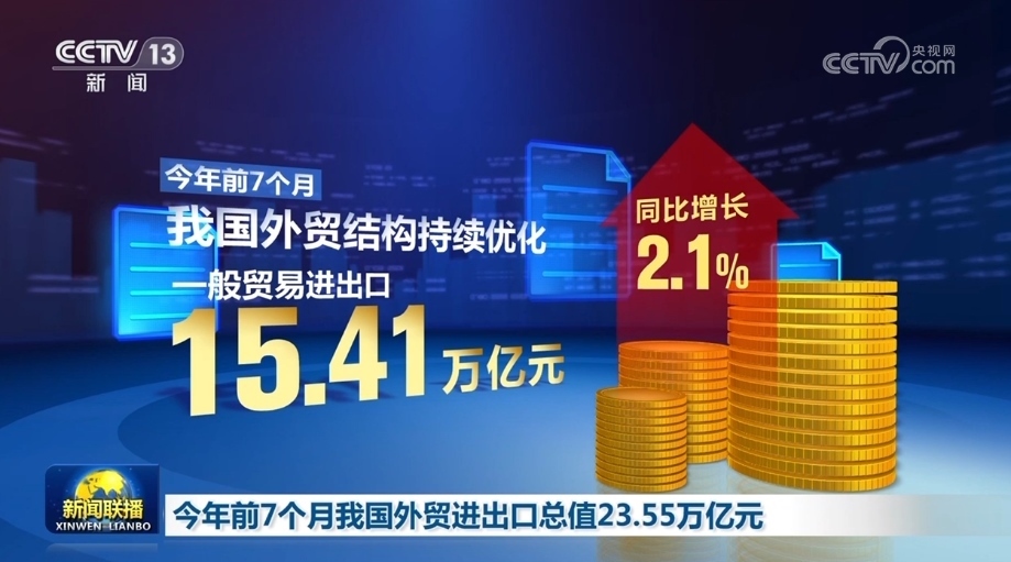 央視網(wǎng)消息(新聞聯(lián)播):海關(guān)總署今天(8月8日)對外公布,今年前7個月,我國貨物貿(mào)易進(jìn)出口總值23.55萬億元,外貿(mào)運(yùn)行平穩(wěn)、符合預(yù)期。
