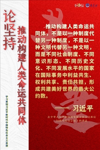 習(xí)近平總書記強(qiáng)調(diào),我們要與世界各國人民同心協(xié)力,構(gòu)建人類命運(yùn)共同體,建設(shè)持久和平、普遍安全、共同繁榮、開放包容、清潔美麗的世界。