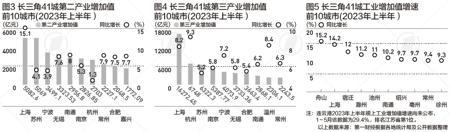 第一財經記者梳理公開數(shù)據(jù)發(fā)現(xiàn),長三角41城中,共有8個城市的上半年GDP超5000億元,6市增速達到或超過8%。