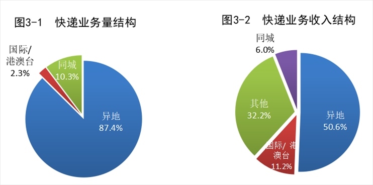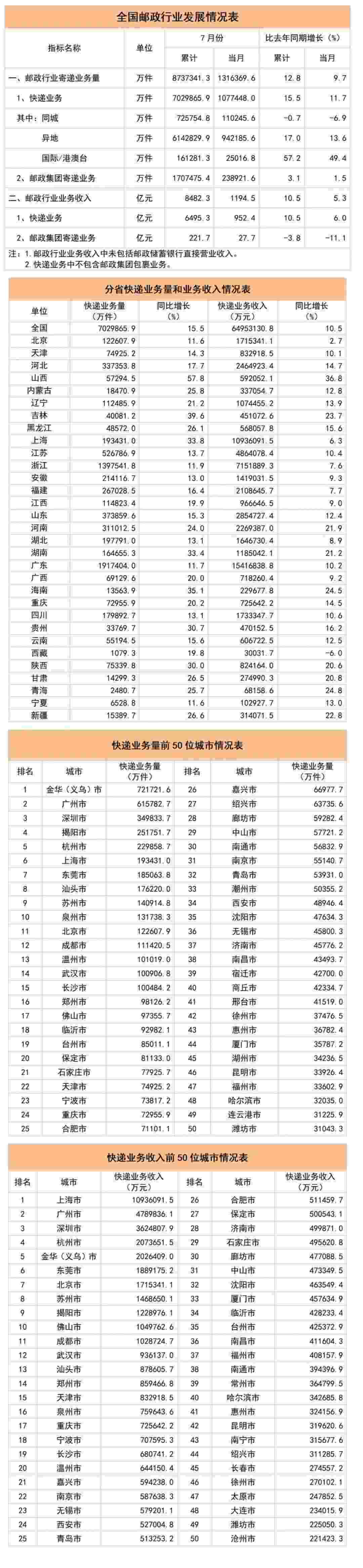 1-7月,郵政行業(yè)業(yè)務(wù)收入(不包括郵政儲(chǔ)蓄銀行直接營(yíng)業(yè)收入)累計(jì)完成8482.3億元,同比增長(zhǎng)10.5%。其中,快遞業(yè)務(wù)收入累計(jì)完成6495.3億元,同比增長(zhǎng)10.5%。7月份,郵政行業(yè)寄遞業(yè)務(wù)量完成131.6億件,同比增長(zhǎng)9.7%。其中,快遞業(yè)務(wù)量完成107.7億件,同比增長(zhǎng)11.7%。7月份,郵政行業(yè)業(yè)務(wù)收入完成1194.5億元,同比增長(zhǎng)5.3%。其中,快遞業(yè)務(wù)收入完成952.4億元,同比增長(zhǎng)6.0%。1-7月,同城、異地、國(guó)際/港澳臺(tái)快遞業(yè)務(wù)量分別占全部快遞業(yè)務(wù)量的10.3%、87.4%和2.3%;業(yè)務(wù)收入分別占全部快遞收入的6.0%、50.6%和11.2%。與去年同期相比,同城快遞業(yè)務(wù)量的比重下降1.7個(gè)百分點(diǎn),異地快遞業(yè)務(wù)量的比重上升1.1個(gè)百分點(diǎn),國(guó)際/港澳臺(tái)業(yè)務(wù)量的比重上升0.6個(gè)百分點(diǎn)。