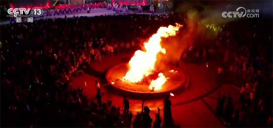 晚會結束后,現場點燃晚會中央的火堆,大家圍著火堆跳起歡樂的達體舞,璀璨的煙花、耀眼的燈光、激情的火把讓現場的群眾感受到了濃濃的節(jié)日氛圍。