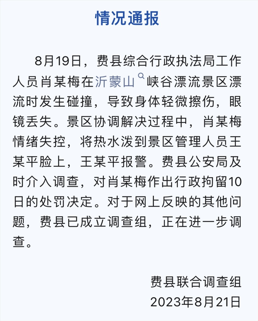 ·山東費(fèi)縣行政執(zhí)法局一副局長家屬向景區(qū)員工連潑3杯熱水,被行政拘留10日。