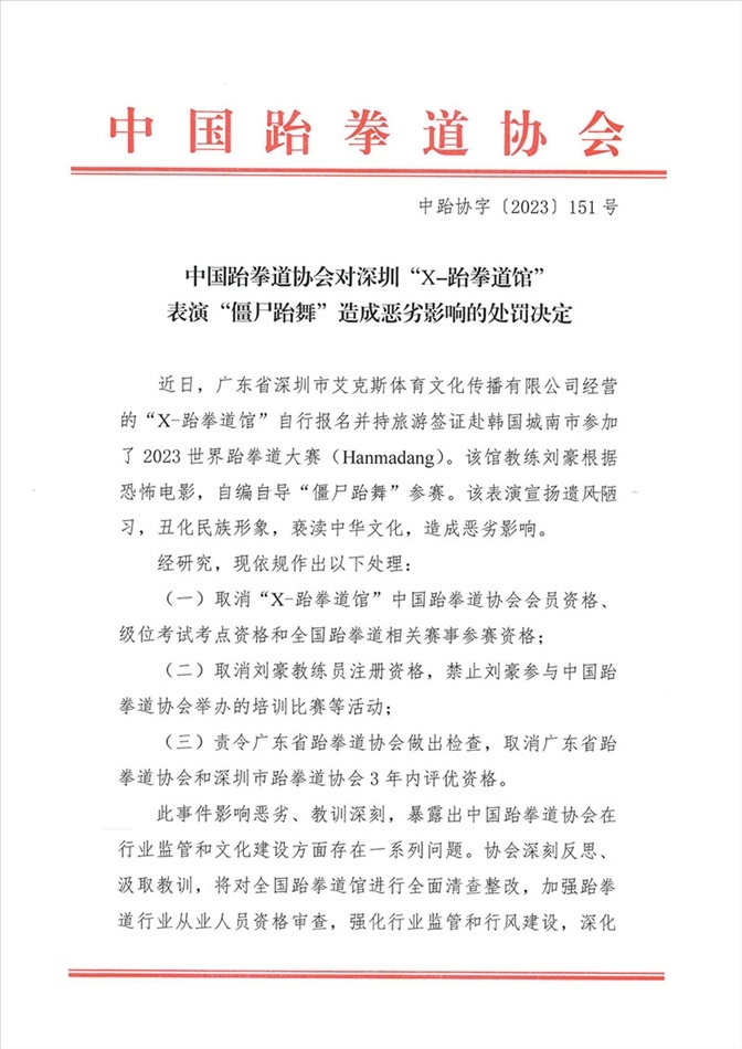 ·在韓表演“僵尸跆舞”跆拳道館被中國跆拳道協(xié)會(huì)處罰:取消會(huì)員和賽事參賽資格。