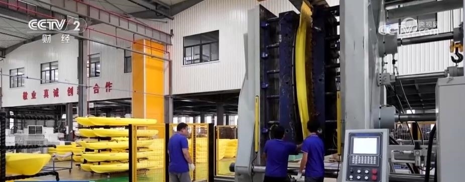 在浙江慈溪的一家皮劃艇企業(yè),記者看到,一條皮劃艇的吹塑生產(chǎn)線正在運轉(zhuǎn)。和傳統(tǒng)的滾塑不同,吹塑工藝成型更快、效率更高。6分鐘左右,一條吹塑皮劃艇可基本成型。