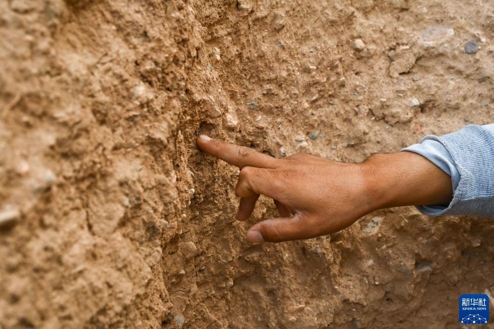 8月20日,董海寧介紹長城墻體修建時用到的芨芨草。新華社記者 劉金海 攝