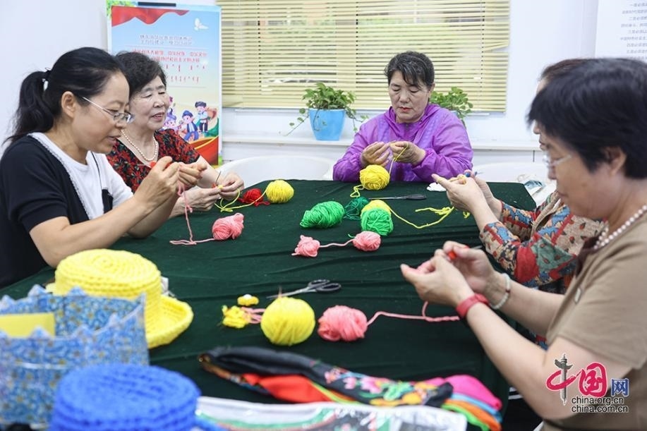 在臨潢家園社區(qū)便民服務(wù)中心內(nèi),各族居民制作手工編織藝術(shù)品。中國(guó)網(wǎng)記者 倫曉璇 攝