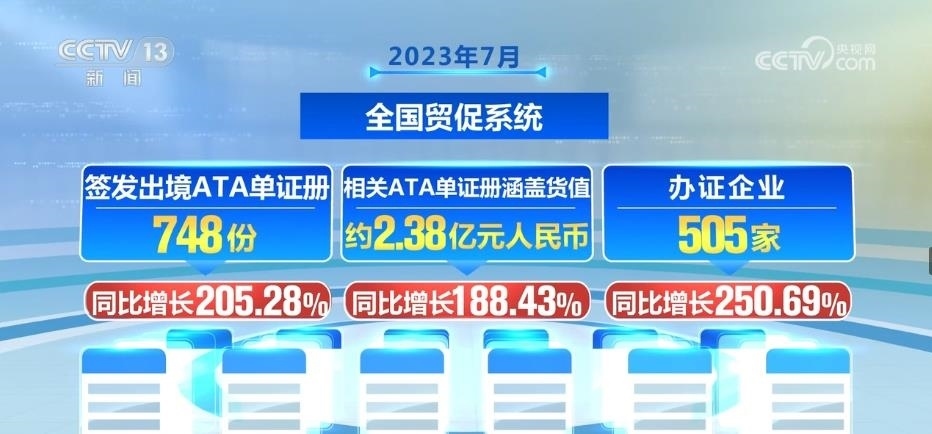2023年7月,全國貿(mào)促系統(tǒng)共簽發(fā)出境ATA單證冊748份,同比增長205.28%;相關(guān)ATA單證冊涵蓋貨值約2.38億元人民幣,同比增長188.43%;辦證企業(yè)505家,同比增長250.69%。