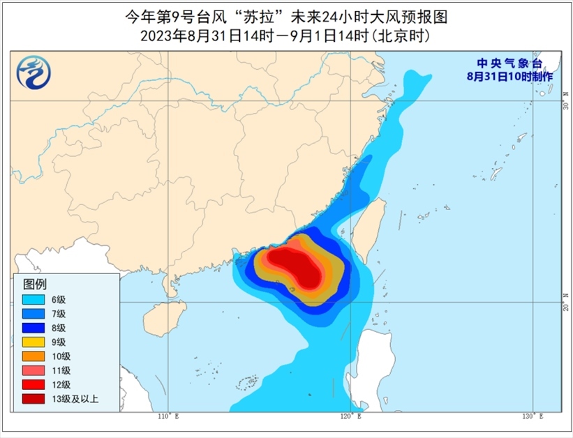 央視網(wǎng)消息:中央氣象臺8月31日10時繼續(xù)發(fā)布臺風(fēng)紅色預(yù)警,今年第9號臺風(fēng)“蘇拉”(超強(qiáng)臺風(fēng)級)的中心今天(31日)上午10點鐘位于廣東汕尾東南方向大約335公里的南海東北部海面上,就是北緯21.0度、東經(jīng)118.0度,中心附近最大風(fēng)力有17級(58米/秒),中心最低氣壓為925百帕,七級風(fēng)圈半徑250-280公里,十級風(fēng)圈半徑130公里,十二級風(fēng)圈半徑70公里。