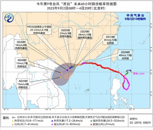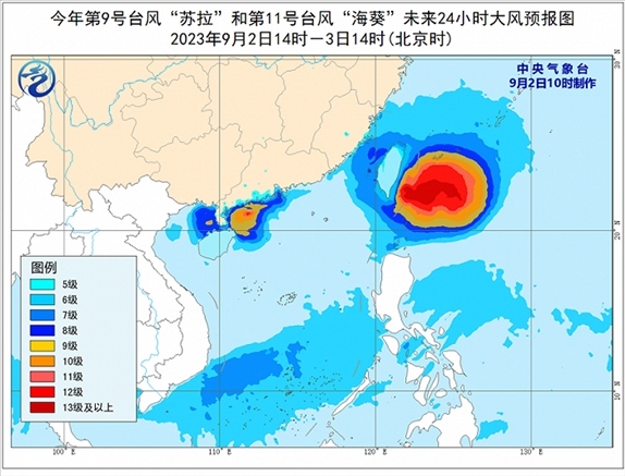 大風(fēng)預(yù)報:9月2日14時至3日14時,受“蘇拉”影響,南海西北部、北部灣東部、瓊州海峽及廣東中西部沿海、廣西南部沿海、海南北部沿海、珠江口以及香港和澳門等地將有6-8級、陣風(fēng)9-10級的大風(fēng),“蘇拉”中心經(jīng)過的附近海面或地區(qū)風(fēng)力有11-12級、陣風(fēng)13-14級;受“??庇绊?,臺灣海峽、巴士海峽、浙江南部沿海、福建沿海、廣東東部沿海、臺灣島沿海將有6-8級,陣風(fēng)9-10級大風(fēng),臺灣以東洋面部分海域風(fēng)力可達9-12級,陣風(fēng)13-14級,“??敝行慕?jīng)過的附近海面風(fēng)力可達13-16級,陣風(fēng)17級及以上。