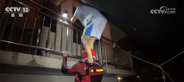 在轉(zhuǎn)移另一處被困人員時(shí),救援人員搭起人梯,讓被困群眾踩著自己的肩膀轉(zhuǎn)移。