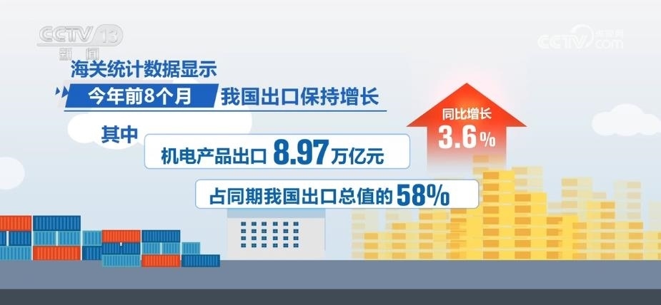 海關(guān)統(tǒng)計(jì)數(shù)據(jù)顯示,2023年前8個(gè)月,我國(guó)出口保持增長(zhǎng),其中,機(jī)電產(chǎn)品出口8.97萬(wàn)億元,同比增長(zhǎng)3.6%,占同期我國(guó)出口總值的58%;汽車(chē)及零配件、船舶、電工器材出口分別增長(zhǎng)50.1%、28%、18.6%。