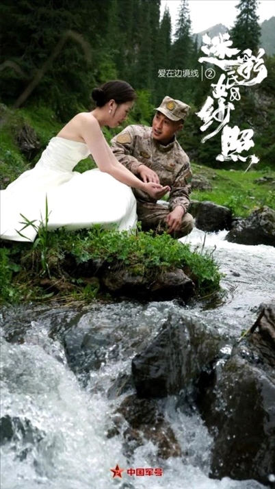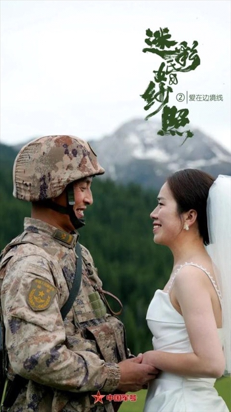 陳健駐守在新疆軍區(qū)紅海溝邊防連,與妻子丁佳結(jié)婚8年,聚少離多,一直遺憾沒有拍過婚紗照。妻子丁佳決定給他一個(gè)驚喜——帶上婚紗,跨越幾千公里,在他巡邏的路上與他“偶遇”!迷彩婚紗照又有“天花板”了!